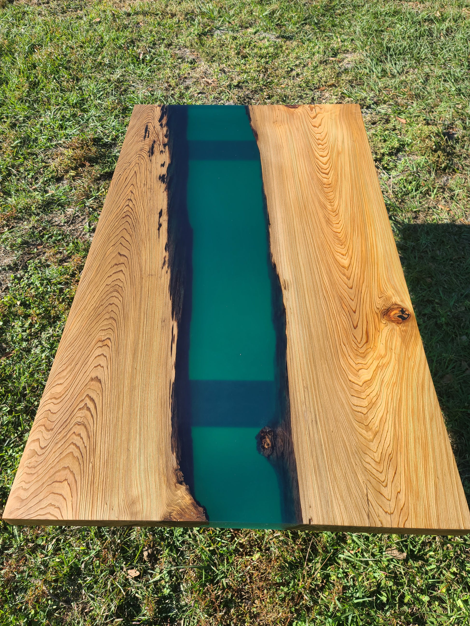 These are custom made to order epoxy and live edge slab hybrid tables. Color of epoxy and wood are chosen by you for a personalized piece that will fit into your home. The table pictured is a Cypress with a green epoxy.