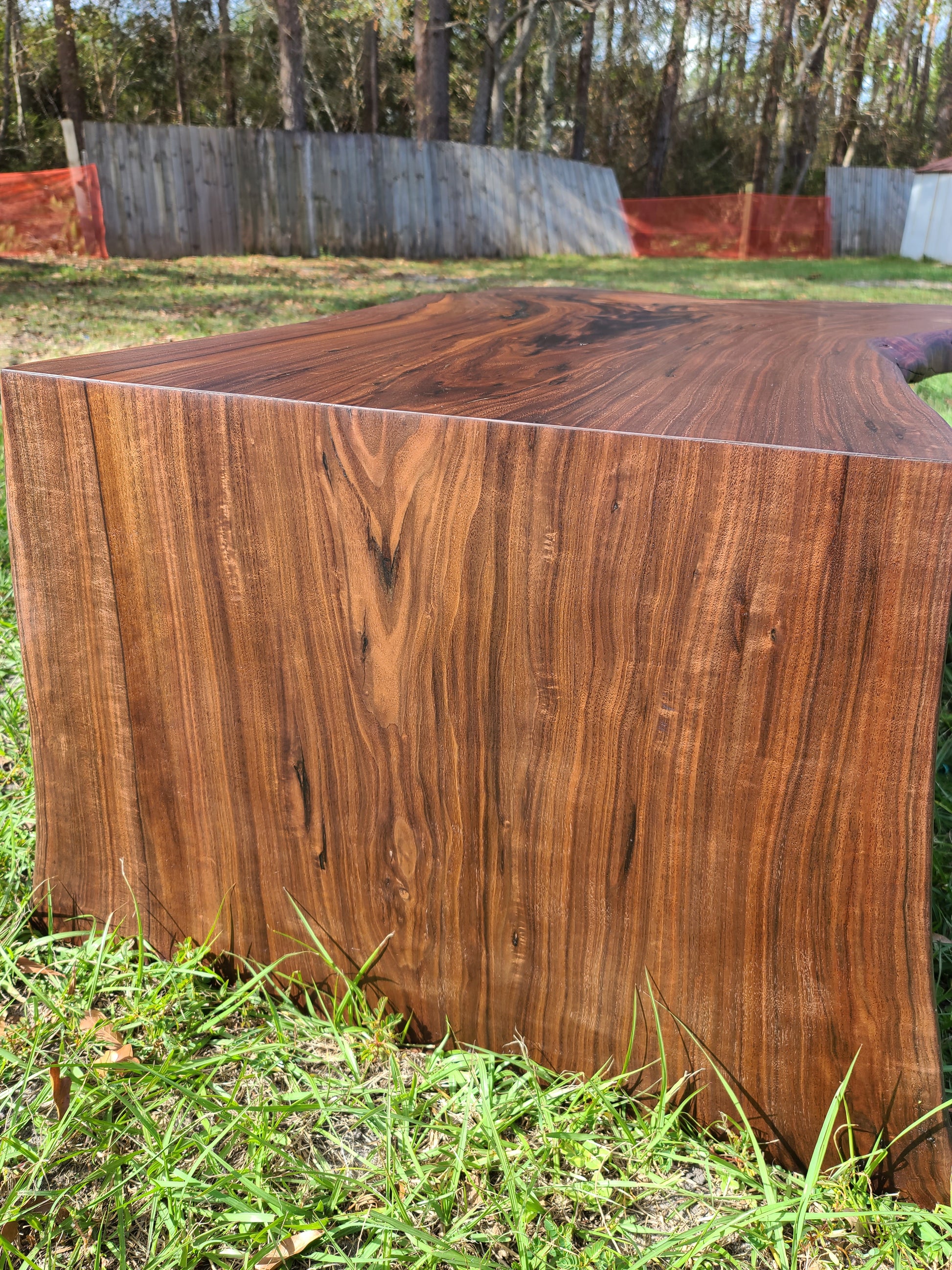 These Walnut Waterfall Coffee Tables are custom pieces made to order! The shape and color of each piece vary from slab to slab. Standard size is 20 inches wide x 4ft long x 16 tall.